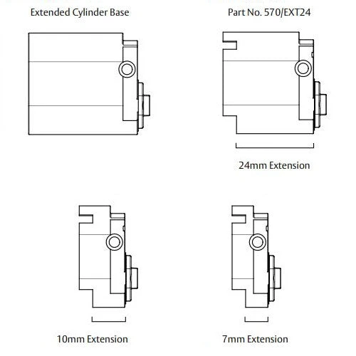 There are three different size extension kits that can be mixed and matched with the extended cylinder base to make up the desired length cylinder. They come in 7mm, 10mm and 24mm sizes. Each kit comes complete with the cylinder extension, barrel extension and universal barrel adaptor screwed to the barrel extension. Once the cylinder is assembled the rear barrel adaptor is removed and the standard locking cam (X, Z, Y, etc.) is fitted to operate the mortice lock.
