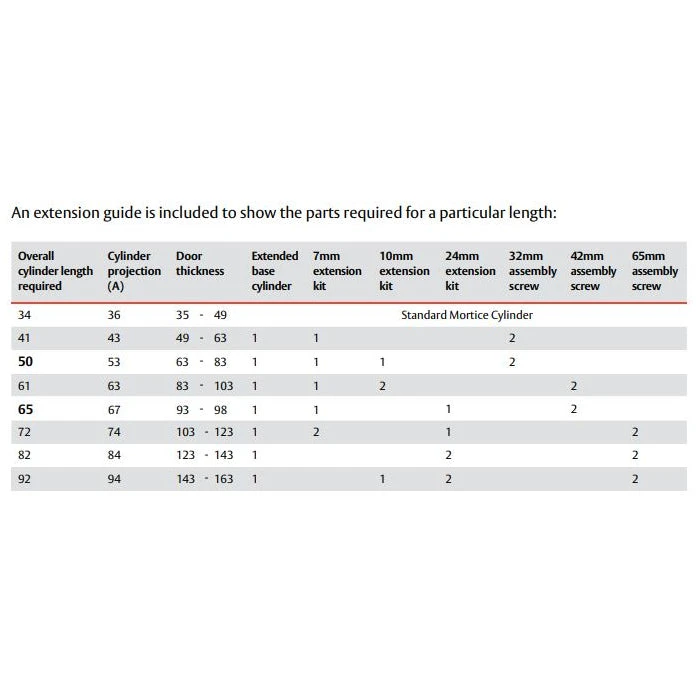 You will need to order the extended base cylinder, the extension kit or kits needed to make up the cylinder length and the assembly screws to hold the extension kits to the extended base cylinder. The end cam will then need to be changed for the required cam needed for the function of the mortice lock.