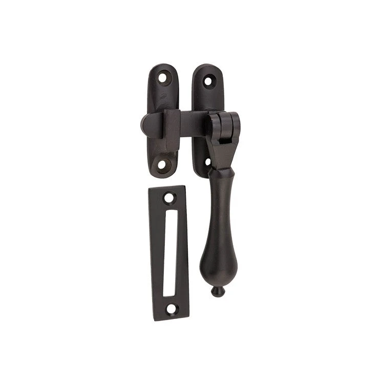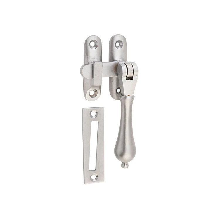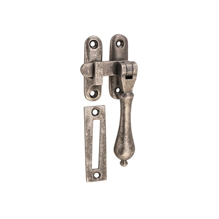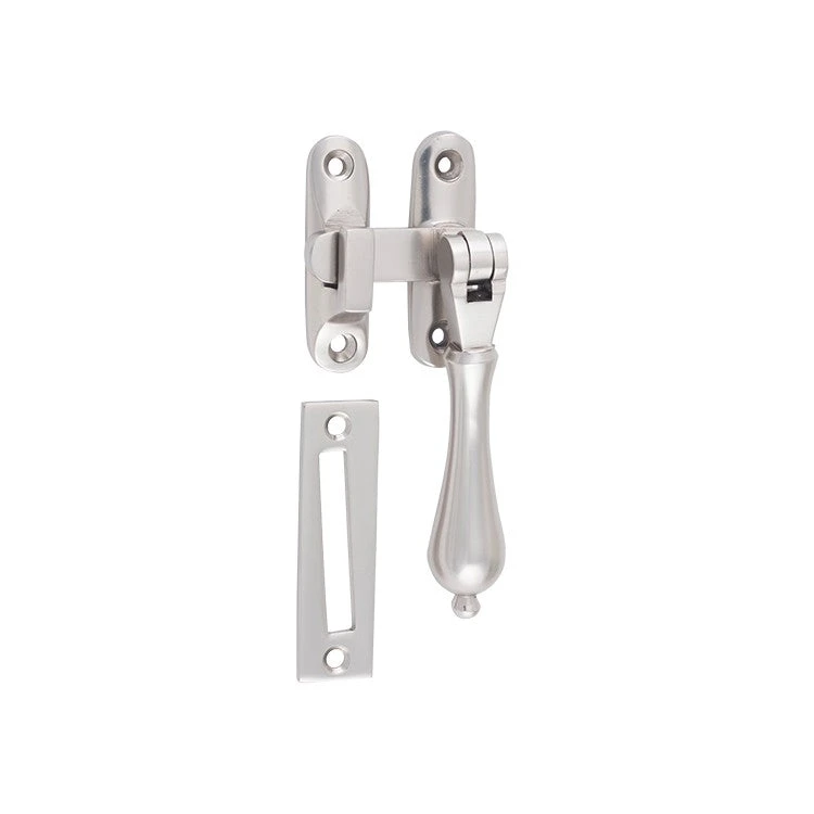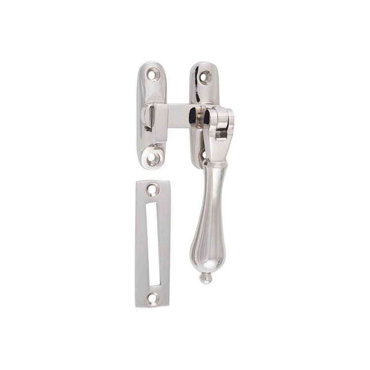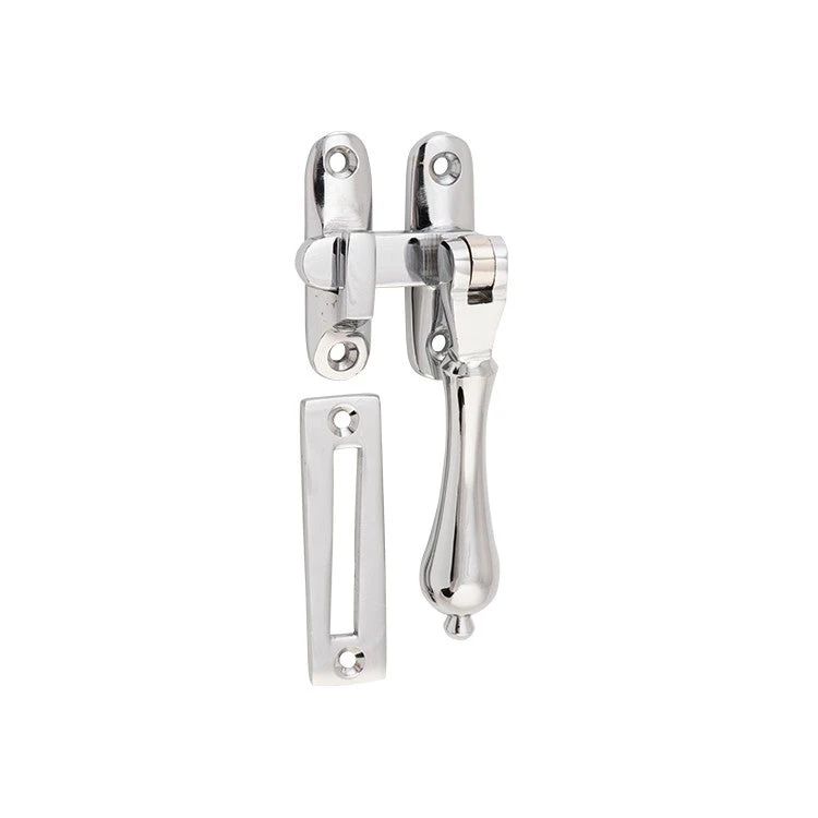 Solid brass teardrop casement fastener with extended tongue for long throw applications.